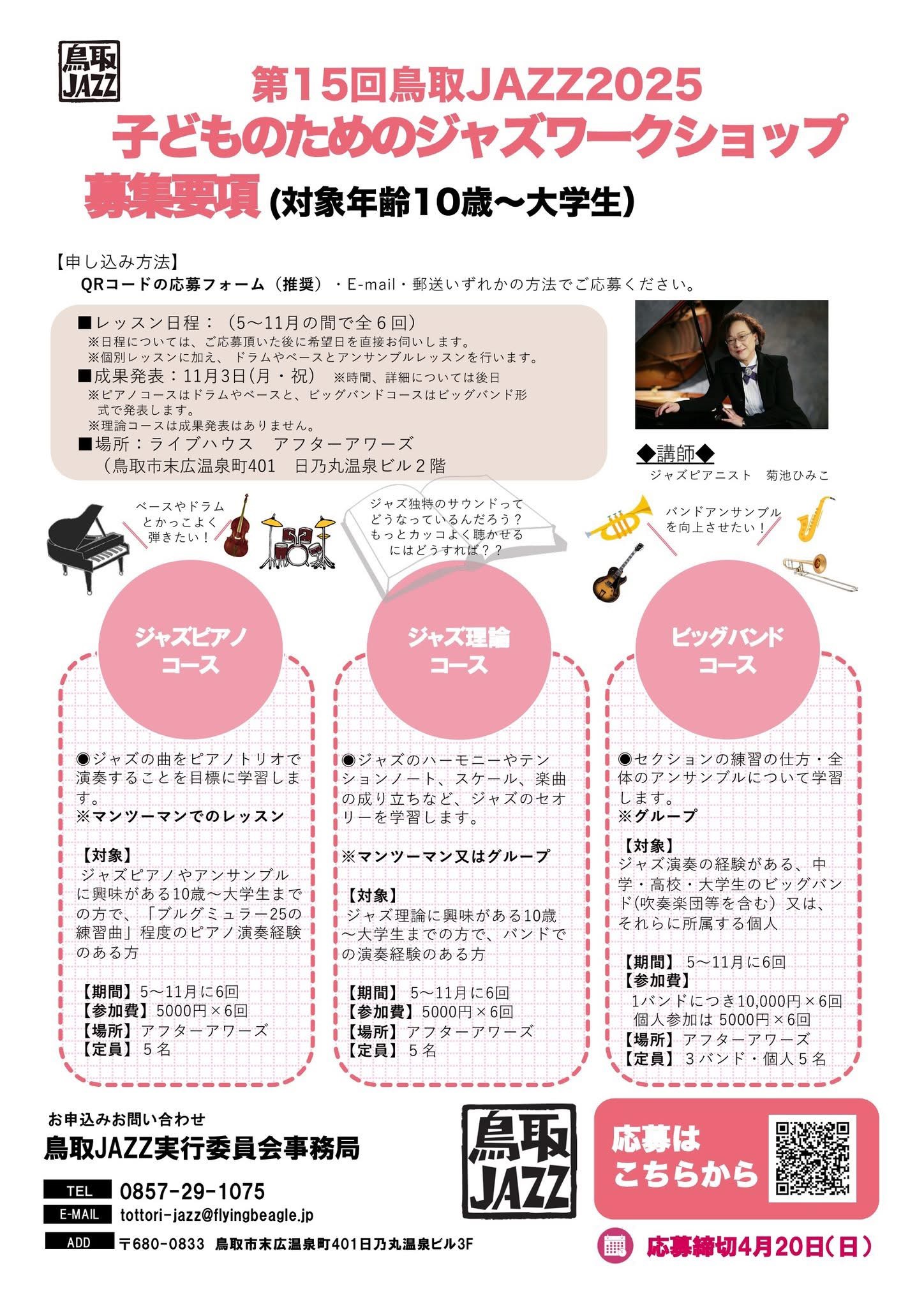 9:00 PM - 10:30 PM 「鳥取JAZZ2025秋の陣クロージングセッション」 2025年11月3日 @ 9:00 PM - 10:30 PM JST 「鳥取JAZZ2025秋の陣クロージングセッション」 「鳥取JAZZ秋の陣クロージングセッション」 鳥取JAZZ2025を締めくくるラストイベント 出演:菊池ひみこ […] ¥1500