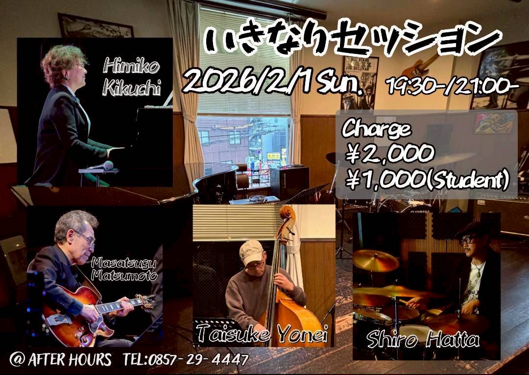 7:30 PM - 10:00 PM いきなりセッション 2026年2月1日 @ 7:30 PM - 10:00 PM JST いきなりセッション いきなりセッション 日時:2026.2/1(日) 19:30~ / 21:00~ 出演:菊池ひみこ(pf) 松 […] ¥2500